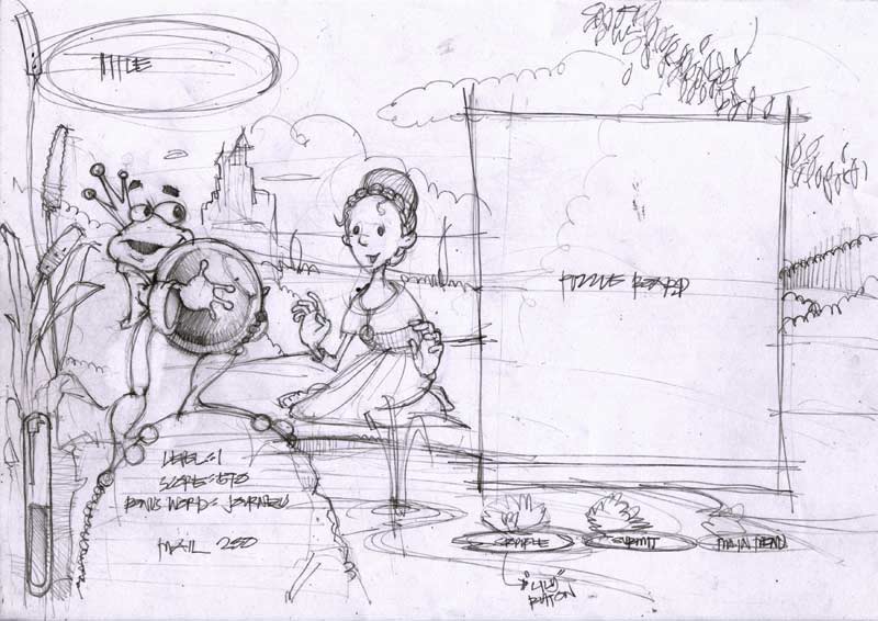 I loved Von’s work, and signed him up to do all the art for the game. Since the above sketch didn’t fit within a specific fairy tale, the first image that was done that actually made it into the main part of the game was from ‘The Frog Prince’.